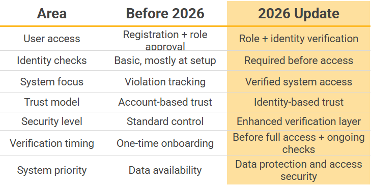 Previously, access was primarily determined by account registration and role approval. Once a user was set up, they could use the system without additional identity checks each time they logged in.