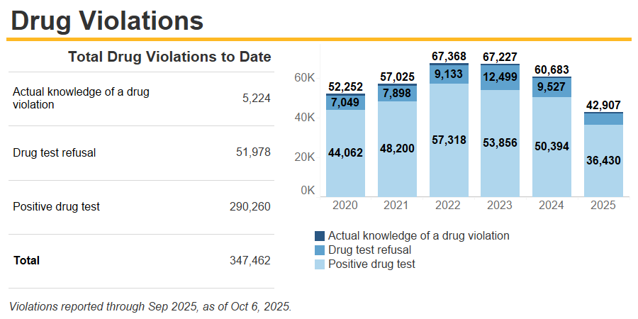 Between 2020 and 2025, the system recorded hundreds of thousands of violations, including positive drug test results, refusals to test, and “actual knowledge” violations reported by employers.