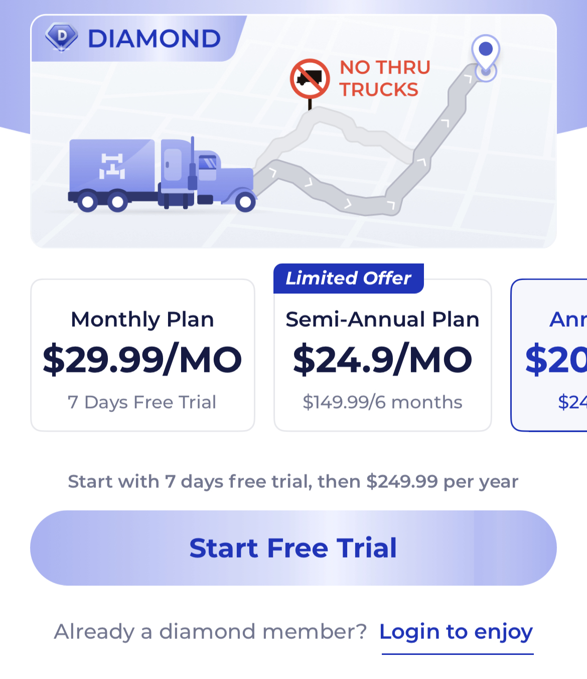 First, consider Trucker Path’s pricing. Trucker Path offers a top-tier subscription (often called the “Diamond” plan) that unlocks truck GPS navigation, real-time traffic, and other perks.