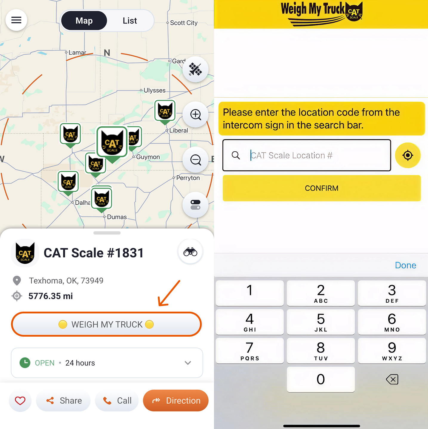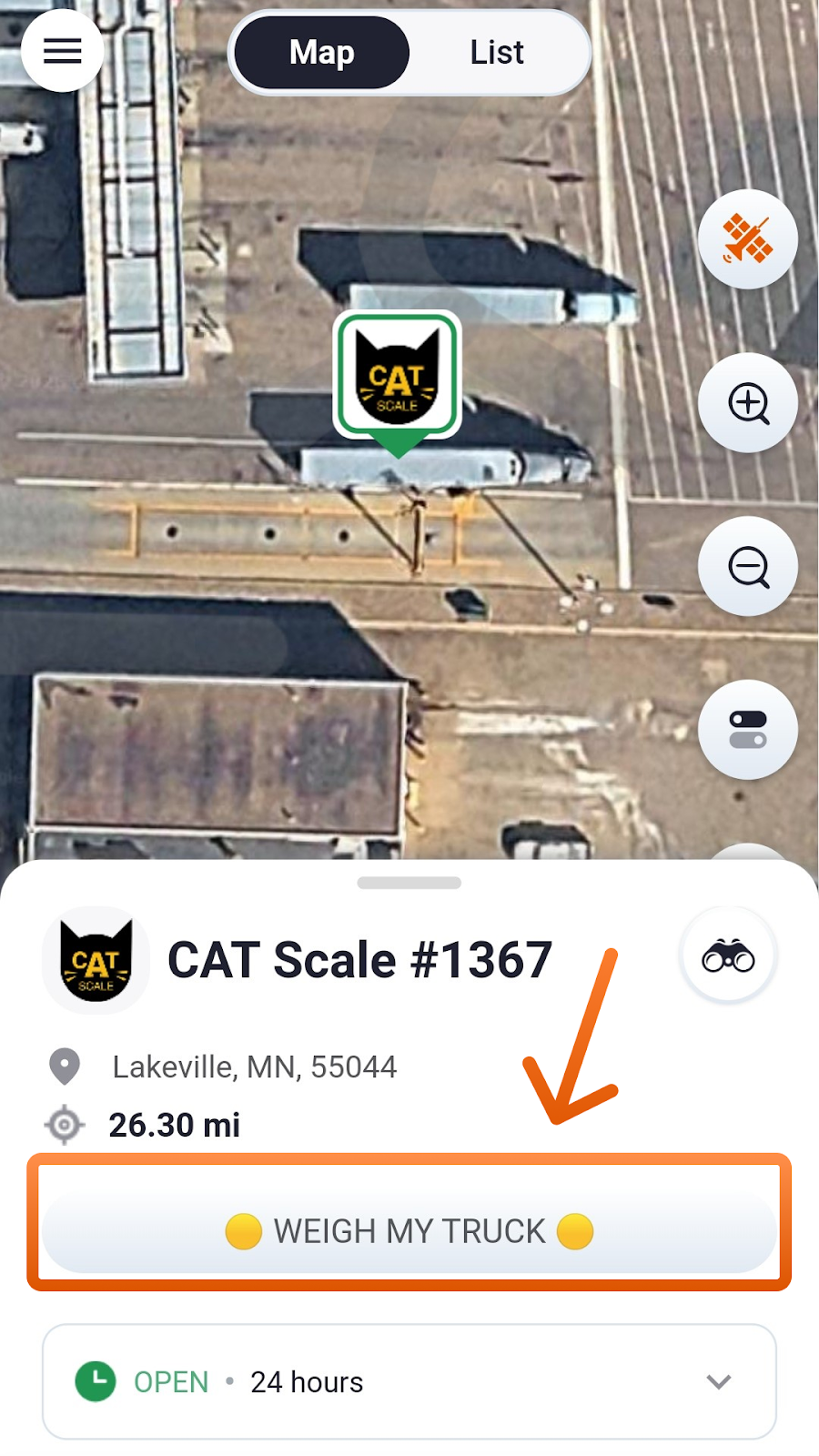 2. Access Weigh My Truck: When you arrive at a CAT Scale location, tap the “WEIGH MY TRUCK” button on the location card to get started.