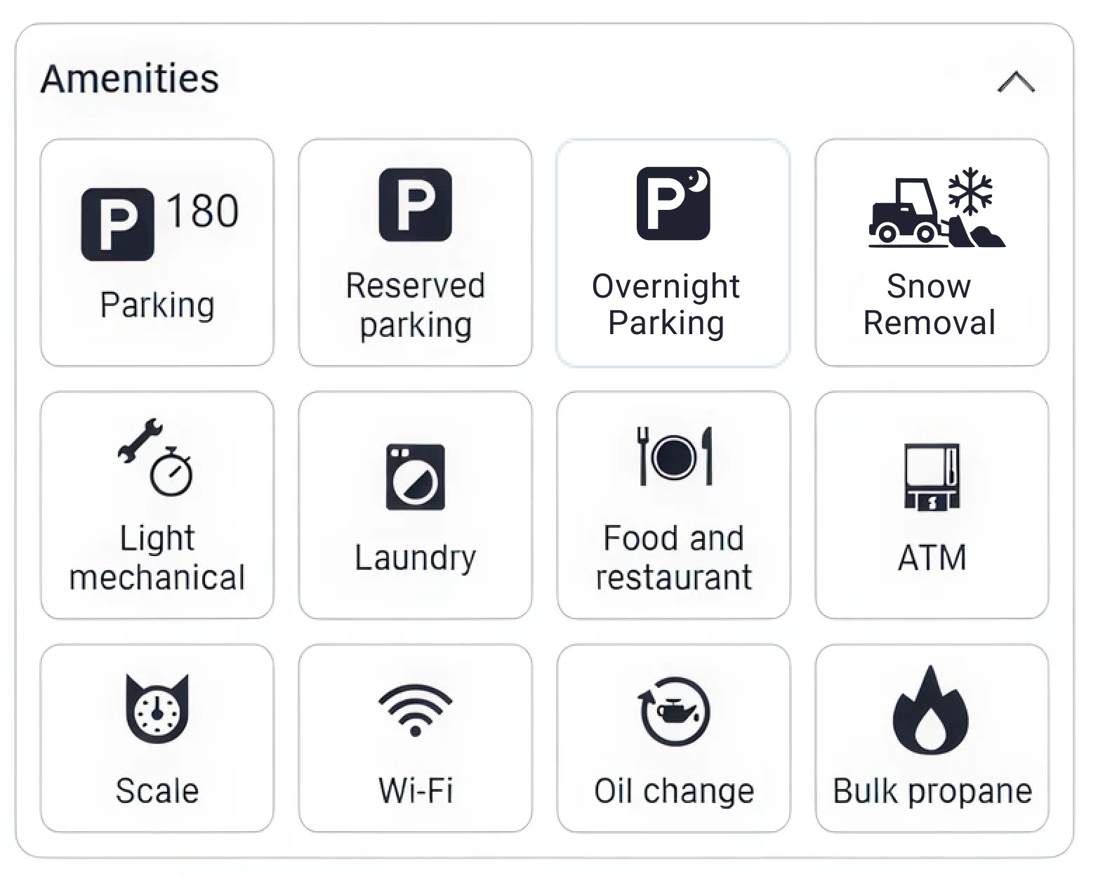 If you operate a truck stop, you can list restrooms, restaurants, diesel fuel prices, the number of truck parking spots, showers, or other amenities. These details allow drivers to plan their stops efficiently.