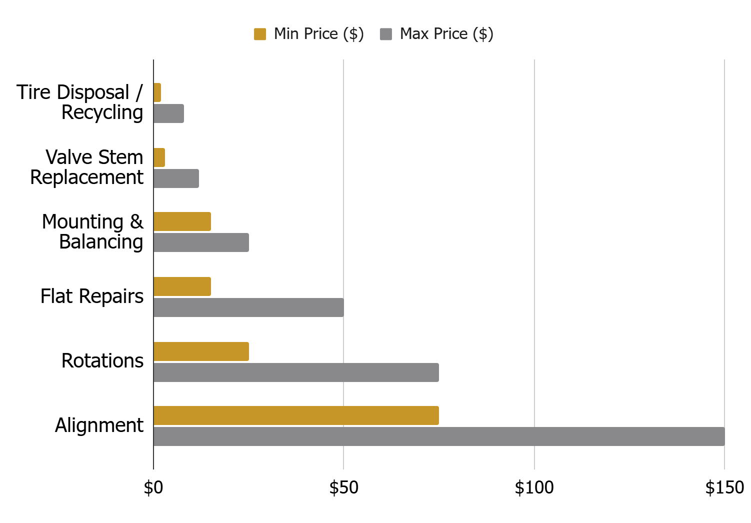 Mounting and balancing typically runs $15 to $25 per tire to eliminate vibrations. Alignments average around $75 to $150 to keep the vehicle tracking straight. Other small services may include rotations, flat repairs, valve stem replacements, and old tire disposal fees, usually around $5 to $20 each.