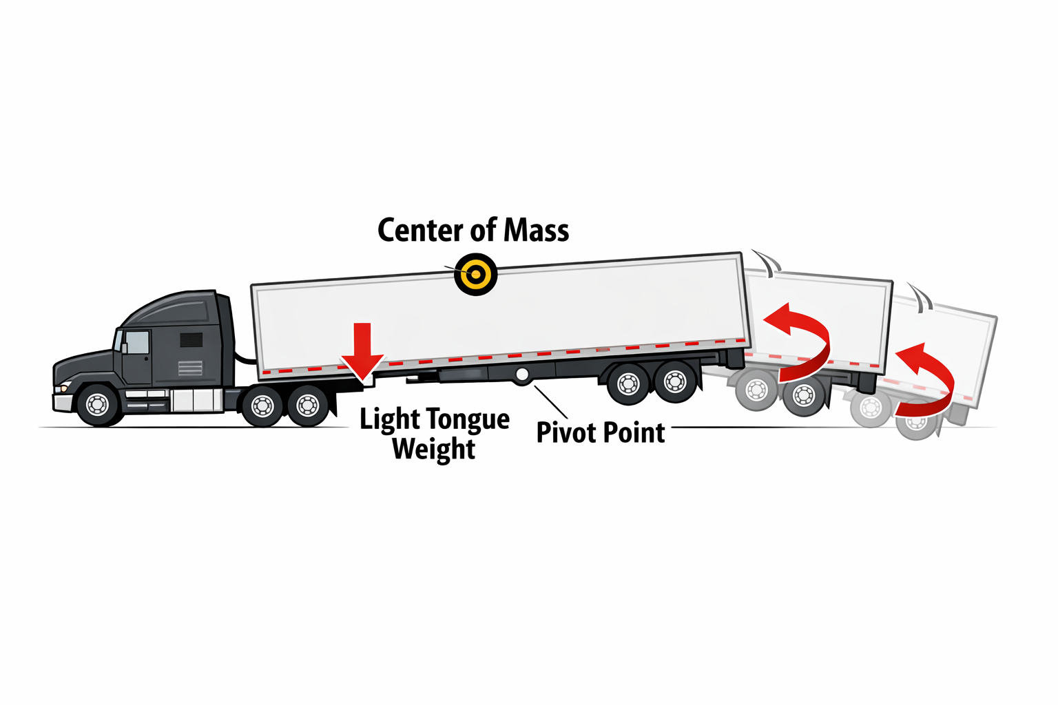Mechanically, the trailer acts like a weight hanging behind the hitch. When the load is balanced right, the hitch and tires naturally pull the trailer back into line after small disturbances. When the balance is off, those same disturbances push the trailer farther out instead of settling it down.