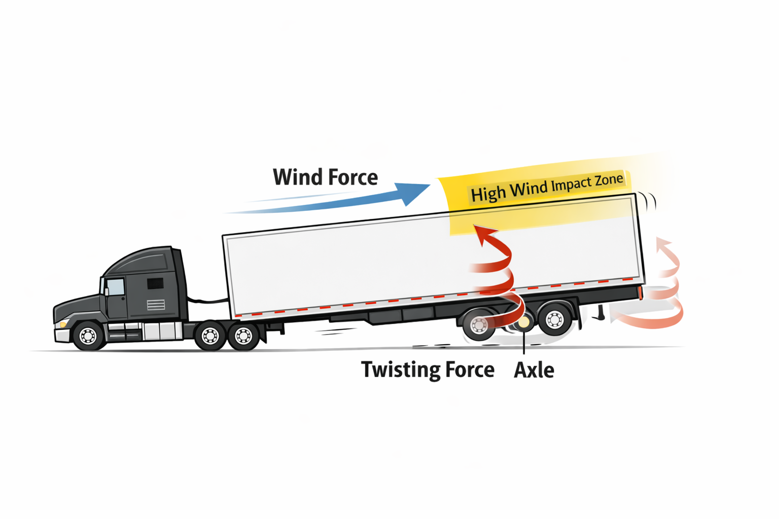 Wind is a major trigger, especially for enclosed or tall trailers. Side force from the wind doesn’t act at ground level. It hits higher up on the trailer body, creating a twisting force around the axle. The taller and flatter the sides, the more leverage the wind has.